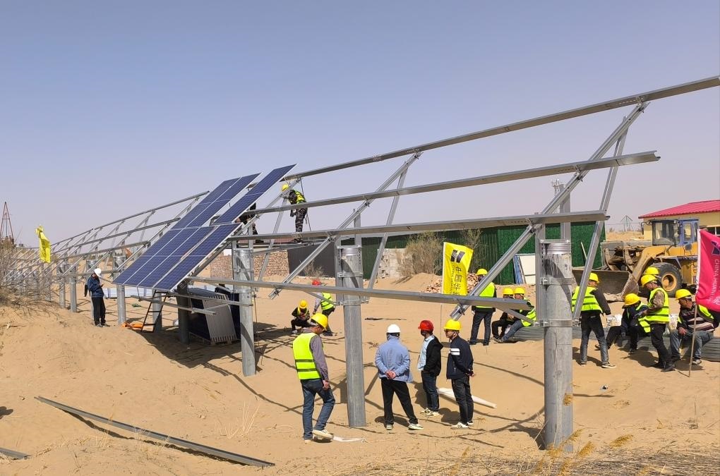 記者在新華林場(chǎng)民樂(lè)作業(yè)區(qū)看到,與其他作業(yè)區(qū)的造林治沙方式相比,這里既沒(méi)有栽樹(shù),也沒(méi)有種草,而是在沙地里“栽”下了一個(gè)個(gè)水泥樁。葛文斌告訴記者:“這里是防沙治沙和風(fēng)電光伏一體化工程項(xiàng)目區(qū)?!浴鄻毒褪菫楹笃诎惭b光伏板、建設(shè)光伏電站做準(zhǔn)備。在光伏板上發(fā)電的同時(shí),我們還可以在光伏板下種植固沙植物,幫助地表植被恢復(fù),達(dá)到既能發(fā)電‘生金’又能實(shí)現(xiàn)沙化土地縮減的雙重功效。”(記者李云平、侯維軼)