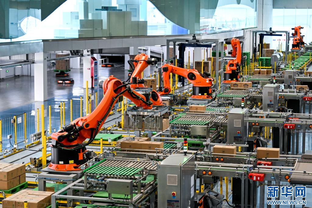 1月9日,在呼和浩特市伊利現代智慧健康谷液態(tài)奶全球智造標桿基地,機械臂在碼放裝箱的奶制品。