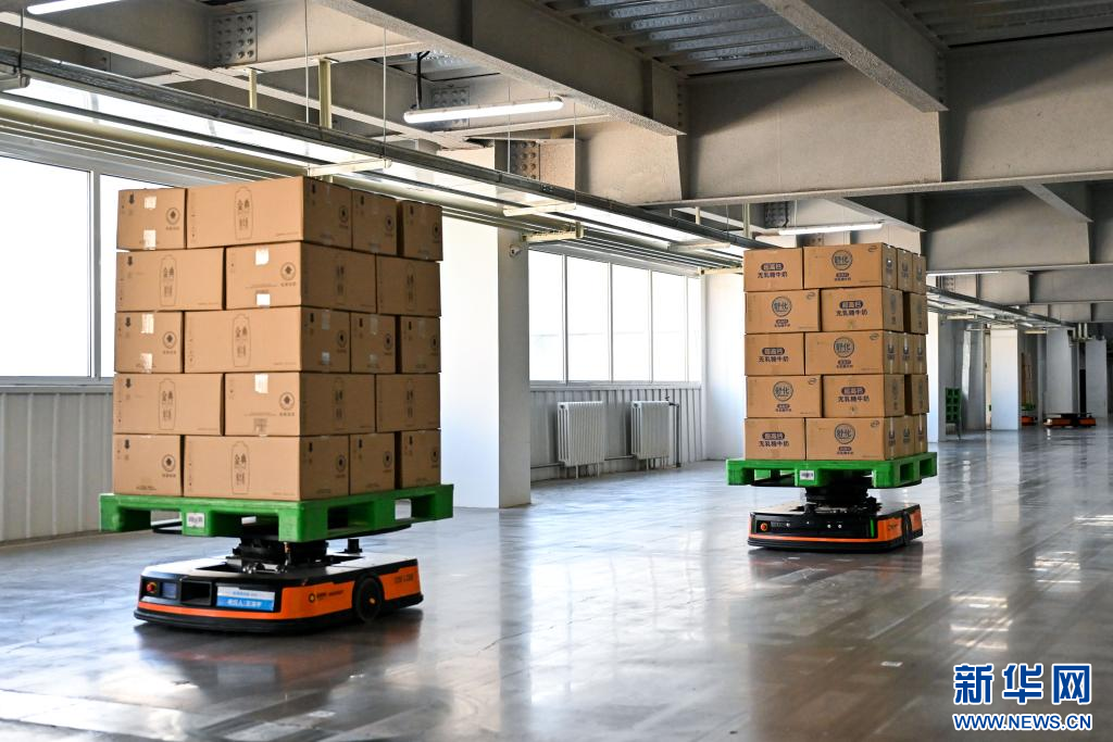 1月9日,在呼和浩特市伊利現代智慧健康谷液態(tài)奶全球智造標桿基地,AGV智能搬運機器人在運送奶制品。