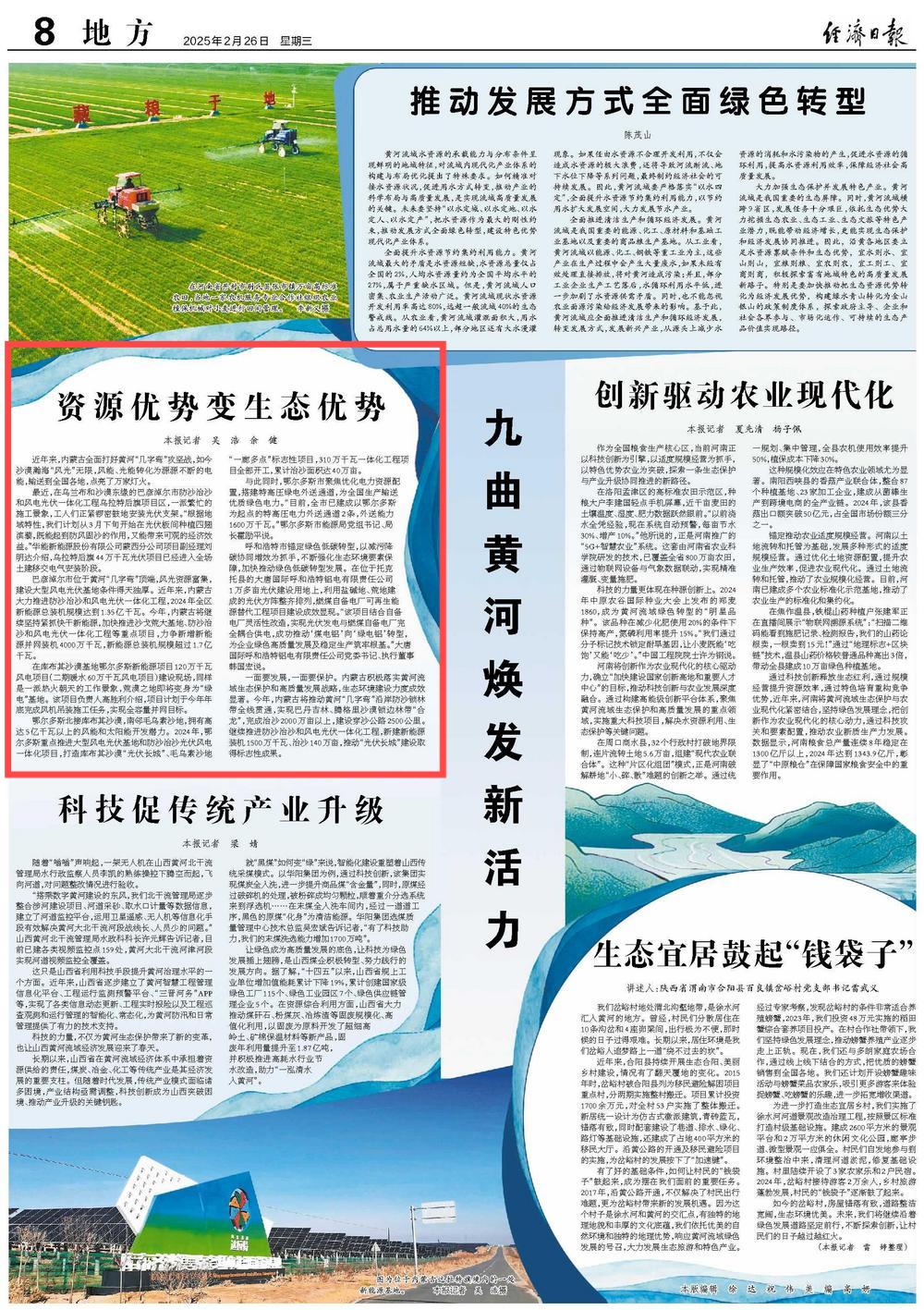 2025年2月26日,《經(jīng)濟(jì)日?qǐng)?bào)》第8版刊發(fā)題為《資源優(yōu)勢(shì)變生態(tài)優(yōu)勢(shì)》的文章,報(bào)道了近年來,內(nèi)蒙古全面打好黃河“幾字彎”攻堅(jiān)戰(zhàn),如今沙漠瀚海“風(fēng)光”無限,風(fēng)能、光能轉(zhuǎn)化為源源不斷的電能,輸送到全國(guó)各地,點(diǎn)亮了萬家燈火。
