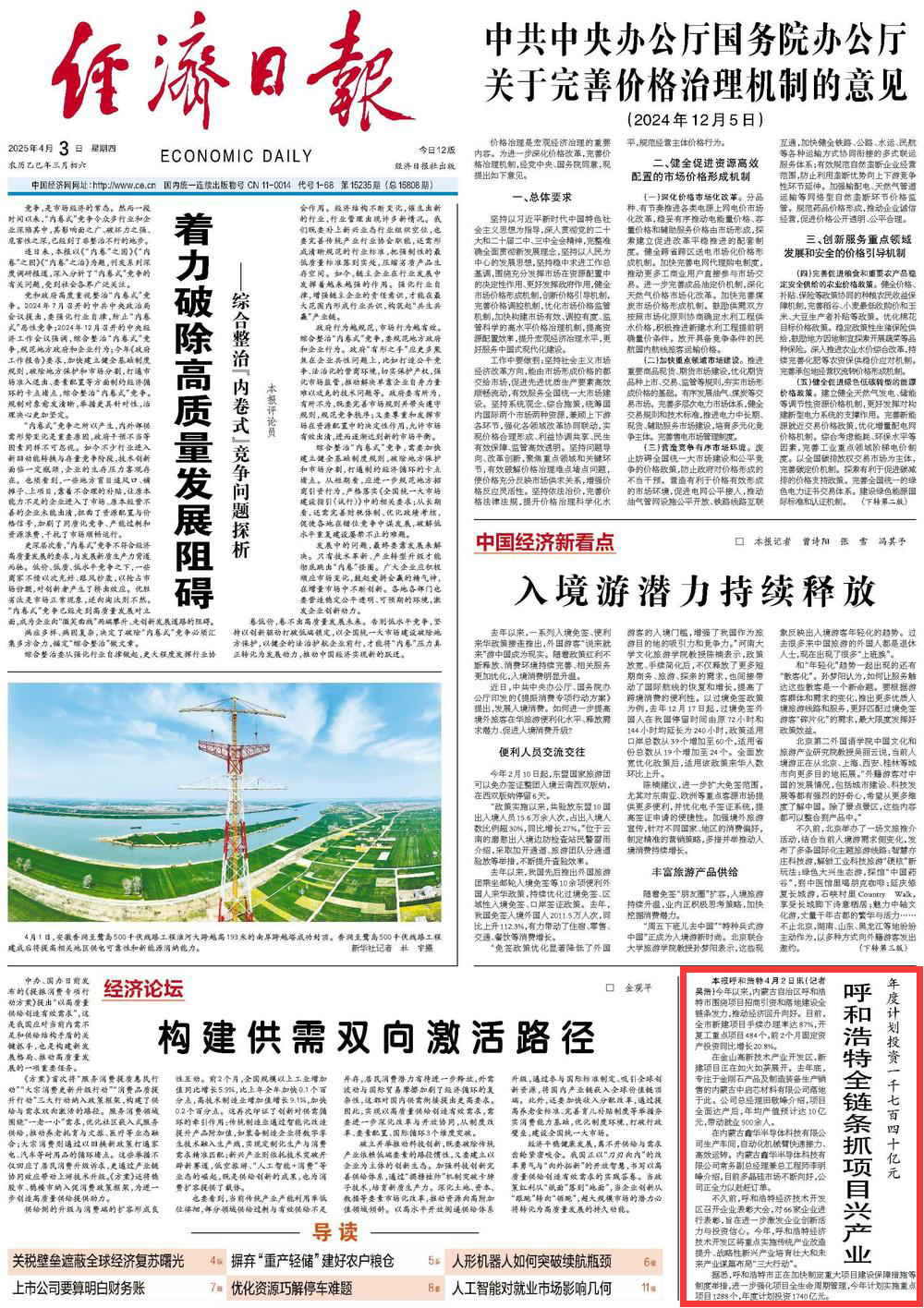 2025年4月3日,《經濟日報》第1版刊發(fā)題為《年度計劃投資一千七百四十億元 呼和浩特全鏈條抓項目興產業(yè)》的文章,報道了今年以來,內蒙古自治區(qū)呼和浩特市圍繞項目招商引資和落地建設全鏈條發(fā)力,推動經濟回升向好。