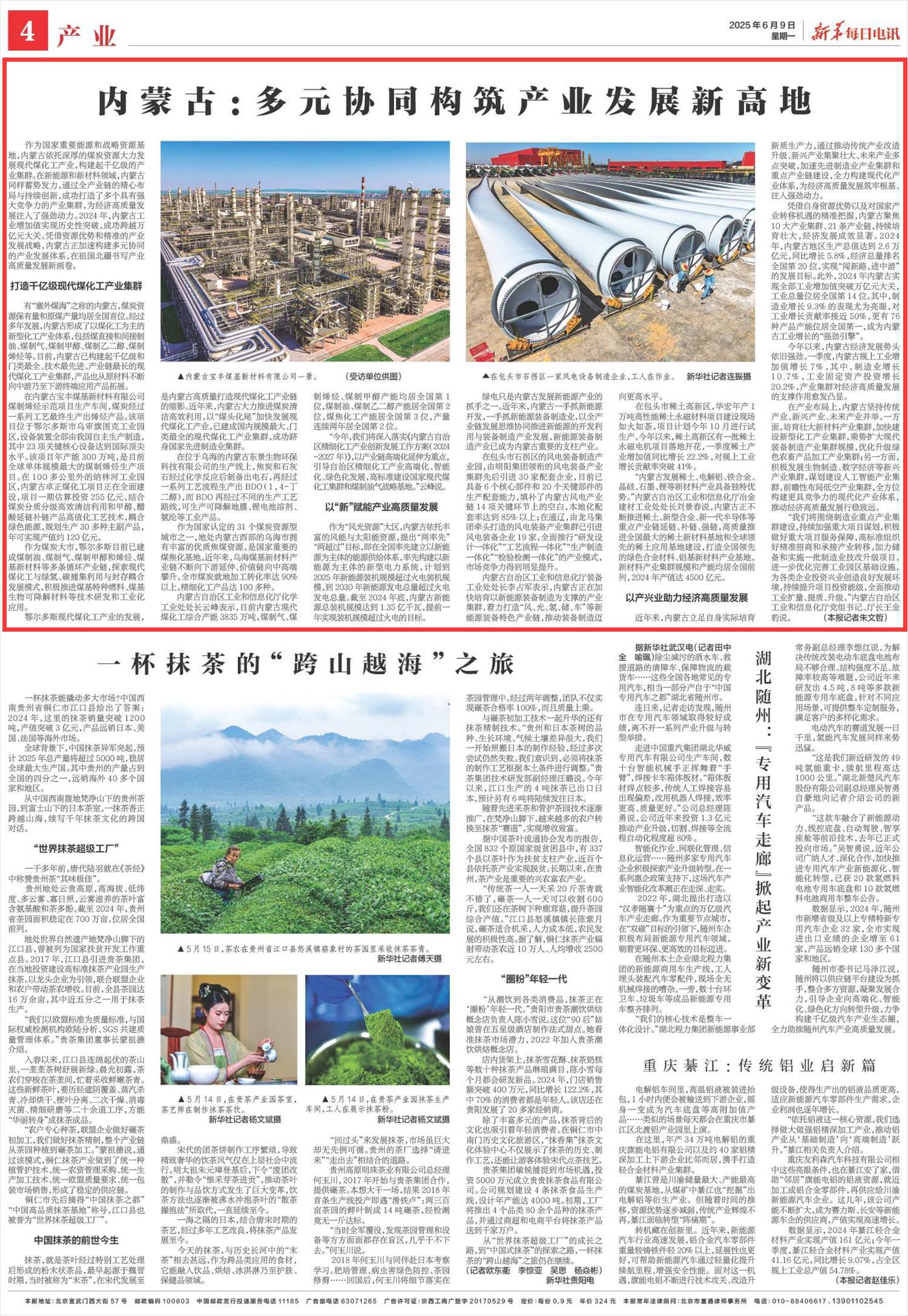 2025年6月9日《新華每日電訊》第4版刊發(fā)了《內(nèi)蒙古:多元協(xié)同構(gòu)筑產(chǎn)業(yè)發(fā)展新高地》的文章,報道了內(nèi)蒙古依托深厚的煤炭資源大力發(fā)展現(xiàn)代煤化工產(chǎn)業(yè),構(gòu)建起千億級的產(chǎn)業(yè)集群。憑借資源優(yōu)勢和精準(zhǔn)的產(chǎn)業(yè)發(fā)展戰(zhàn)略,內(nèi)蒙古正加速構(gòu)建多元協(xié)同的產(chǎn)業(yè)發(fā)展體系,在祖國北疆書寫產(chǎn)業(yè)高質(zhì)量發(fā)展新畫卷。