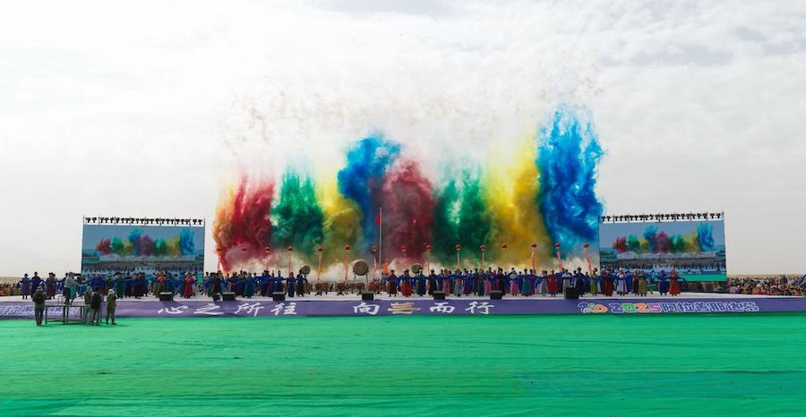 2025阿拉善那達(dá)慕開幕式現(xiàn)場,舞臺(tái)上五彩煙霧升騰