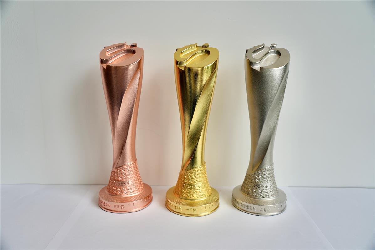 獎杯頂部為會徽“奮進”,以傾斜45度的方式呈現(xiàn);外形采用扭轉(zhuǎn)升騰樣式設(shè)計,體現(xiàn)了各民族運動員在少數(shù)民族傳統(tǒng)體育運動會賽場上英勇矯健的身姿和拼搏向上的精神。底部為紅山文化彩陶雙旋紋環(huán)繞四周,并鐫刻“2025·赤峰”,既展現(xiàn)中華優(yōu)秀傳統(tǒng)文化,又明確了本屆運動會舉辦地區(qū)及時間,激勵各民族運動員以參加本屆全區(qū)少數(shù)民族傳統(tǒng)體育運動會為榮耀,傳承和弘揚民族傳統(tǒng)體育文化,構(gòu)筑中華民族共有精神家園,鑄牢中華民族共同體意識。獎杯整體開模澆鑄,鋅合金制作,表面電鍍金、銀、銅顏色。(記者 肖璐)