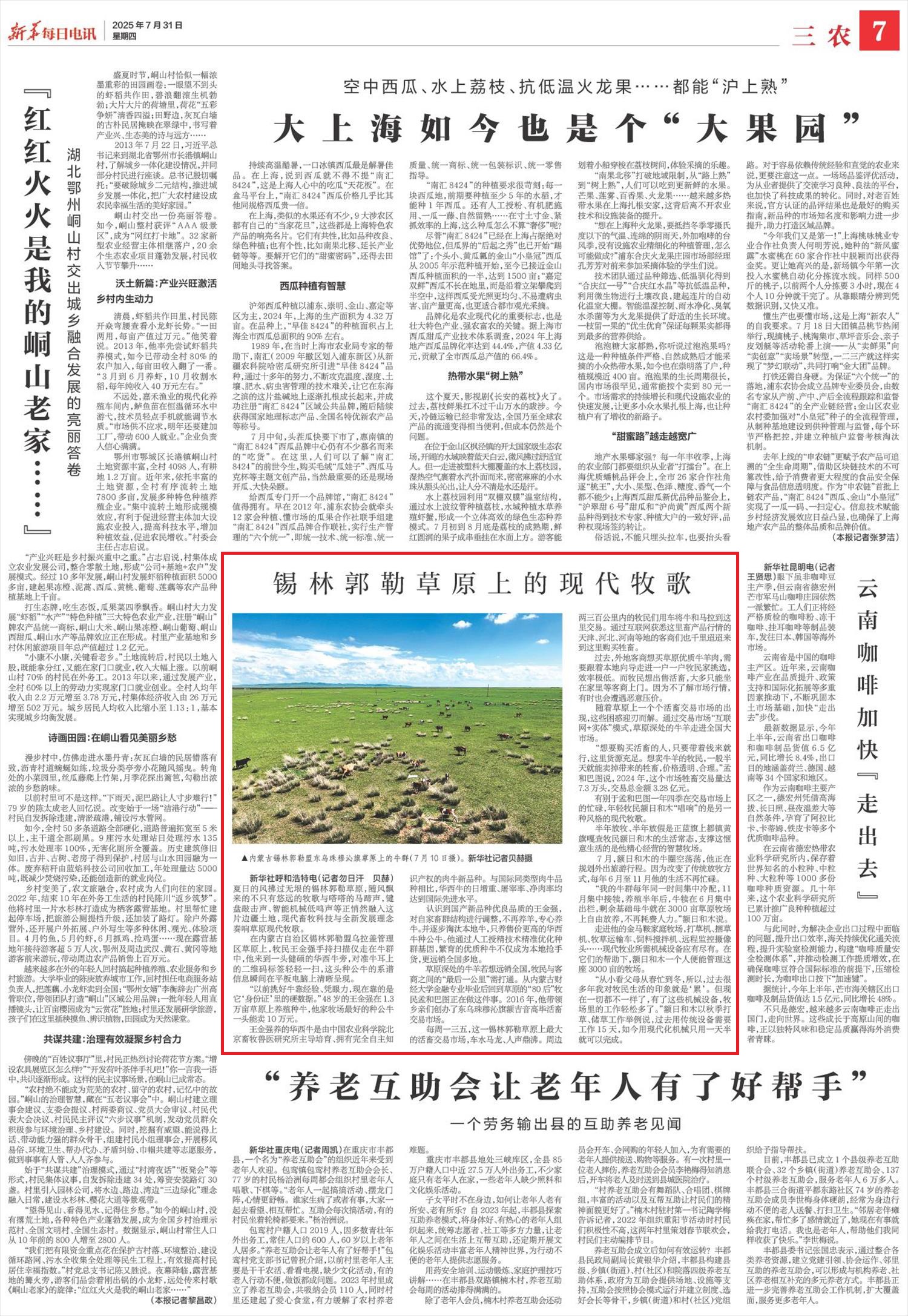 2025年7月31日,《新華每日電訊》第7版刊發(fā)題為《錫林郭勒草原上的現(xiàn)代牧歌》的文章,報道了夏日的風拂過無垠的錫林郭勒草原,隨風飄來的不只有悠遠的牧歌與嗒嗒的馬蹄聲,鍵盤敲擊聲、智能機械低鳴聲等正悄然融入這片邊疆土地,現(xiàn)代畜牧科技與全新發(fā)展理念奏響草原現(xiàn)代牧歌。