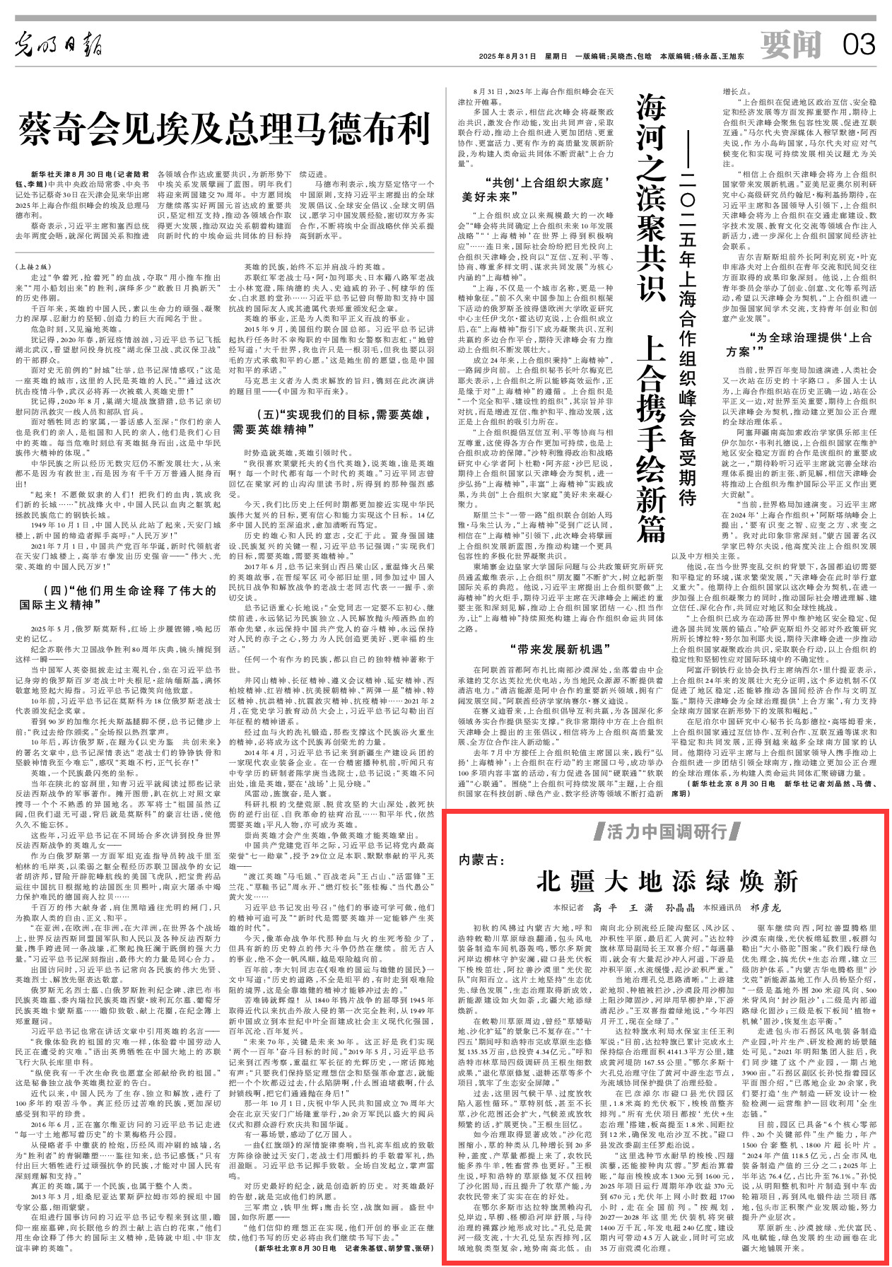 2025年8月31日,《光明日?qǐng)?bào)》第3版刊發(fā)題為《內(nèi)蒙古:北疆大地添綠煥新》的文章,報(bào)道了內(nèi)蒙古堅(jiān)持“生態(tài)優(yōu)先、綠色發(fā)展”,生態(tài)治理取得新成效,新能源建設(shè)如火如荼,北疆大地添綠煥新。