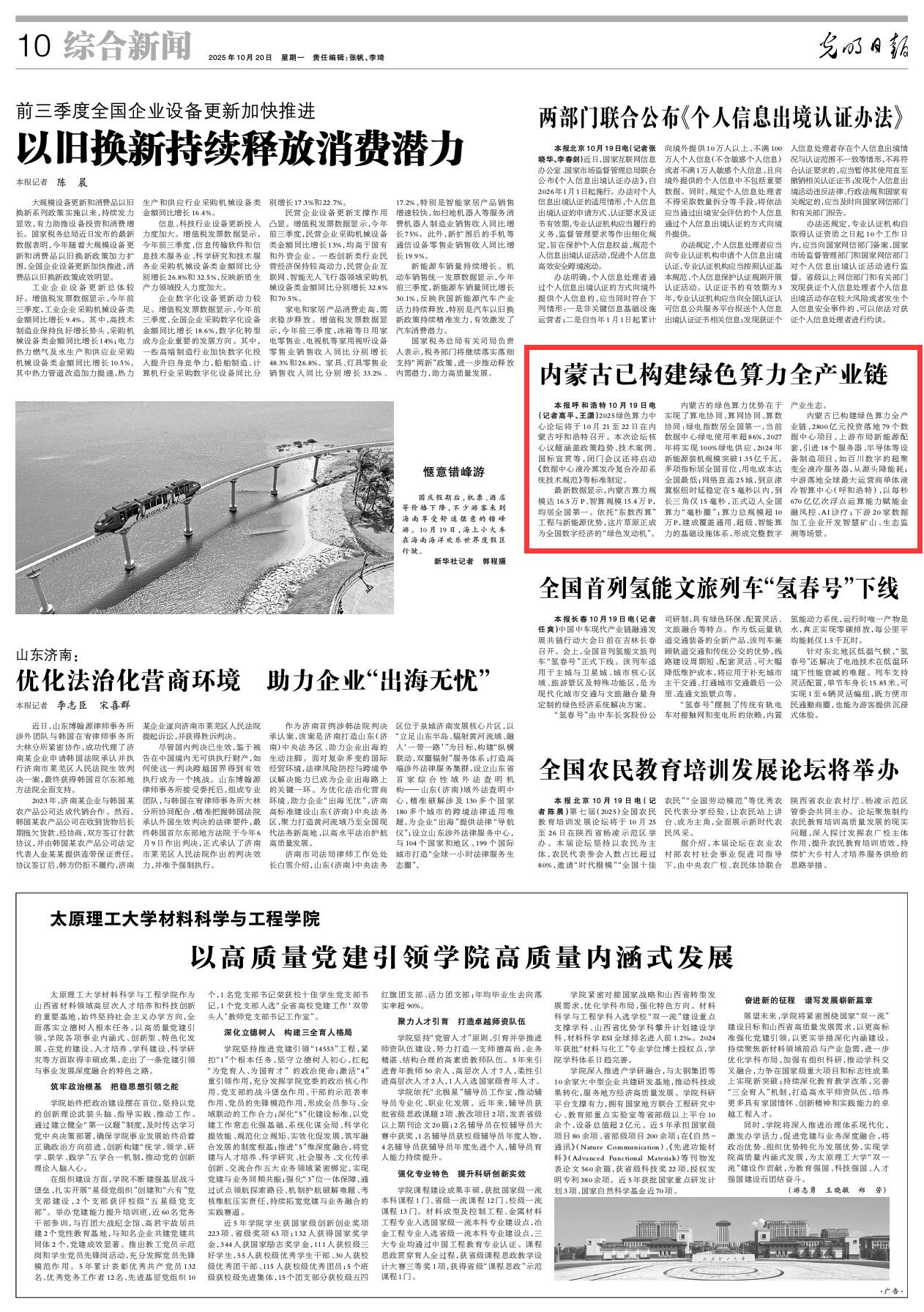 2025年10月20日《光明日報》第10版刊發(fā)了《內(nèi)蒙古已構(gòu)建綠色算力全產(chǎn)業(yè)鏈》的文章,報道了2025綠色算力中心論壇將于10月21至22日在內(nèi)蒙古呼和浩特召開。最新數(shù)據(jù)顯示,內(nèi)蒙古算力規(guī)模達(dá)16.5萬P、智算規(guī)模15.4萬P,均居全國第一。依托“東數(shù)西算”工程與新能源優(yōu)勢,這片草原正成為全國數(shù)字經(jīng)濟(jì)的“綠色發(fā)動機(jī)”。