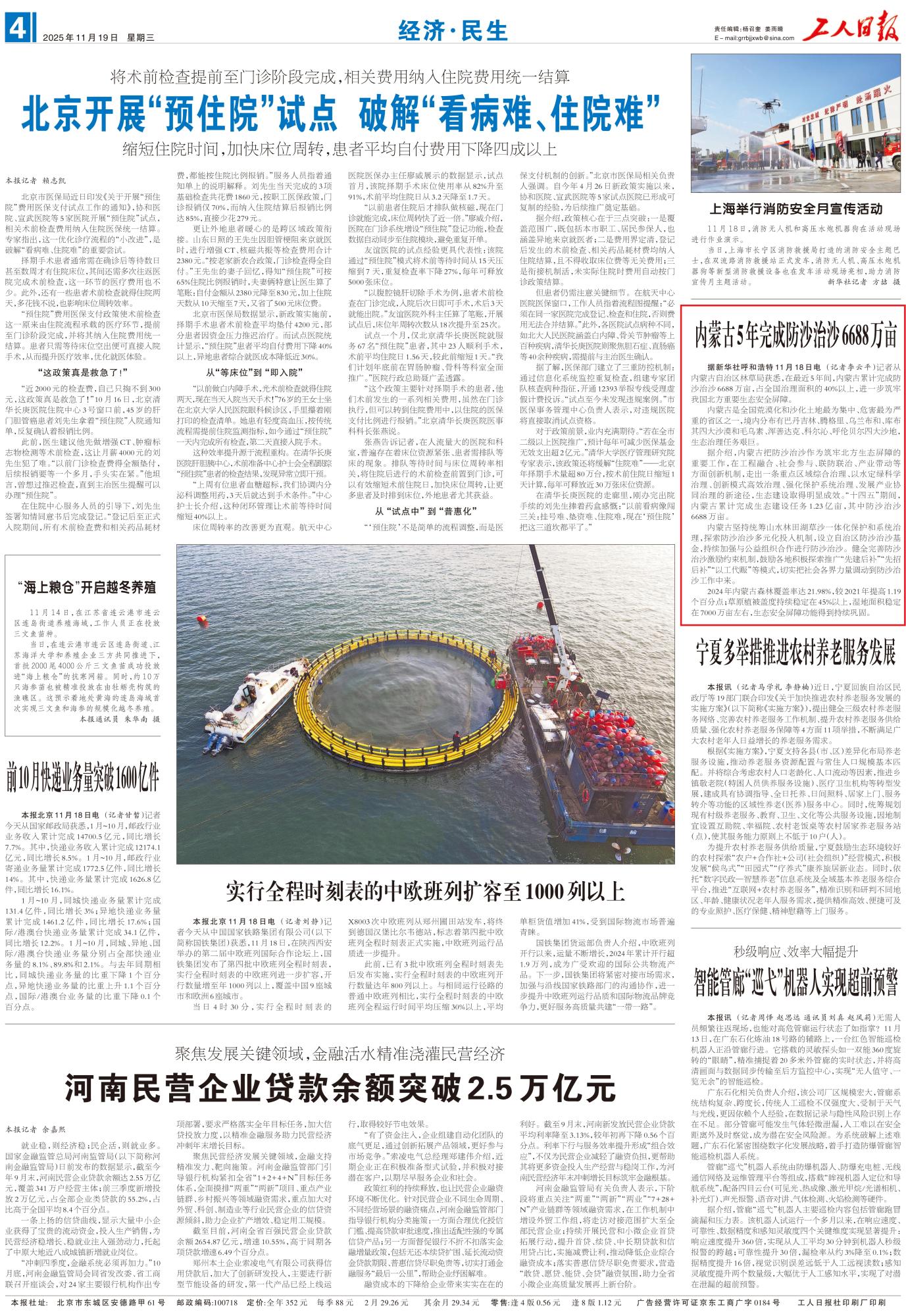 2025年11月19日,《工人日?qǐng)?bào)》第4版刊發(fā)題為《內(nèi)蒙古5年完成防沙治沙6688萬(wàn)畝》的文章,報(bào)道了在最近5年間,內(nèi)蒙古累計(jì)完成防沙治沙6688萬(wàn)畝,占全國(guó)治理面積的40%以上,進(jìn)一步筑牢我國(guó)北方重要生態(tài)安全屏障。
