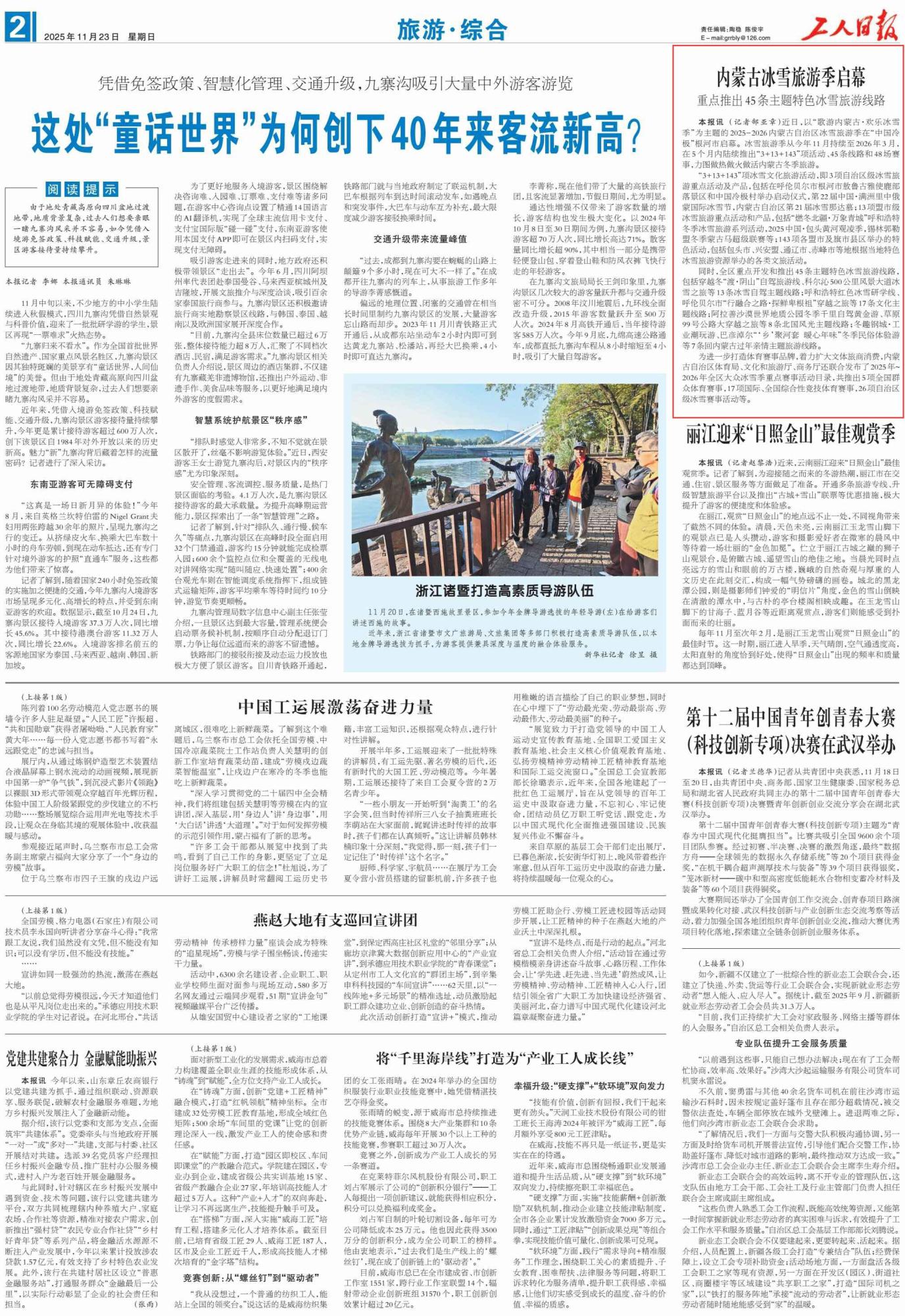2025年11月23日,《工人日?qǐng)?bào)》第2版刊發(fā)題為《內(nèi)蒙古冰雪旅游季啟幕 重點(diǎn)推出45條主題特色冰雪旅游線路》的文章,報(bào)道了2025-2026內(nèi)蒙古自治區(qū)冰雪旅游季近日在“中國(guó)冷極”根河市啟幕。冰雪旅游季從今年11月持續(xù)至2026年3月,陸續(xù)推出“3+13+143”項(xiàng)活動(dòng)、45條線路和48場(chǎng)賽事。