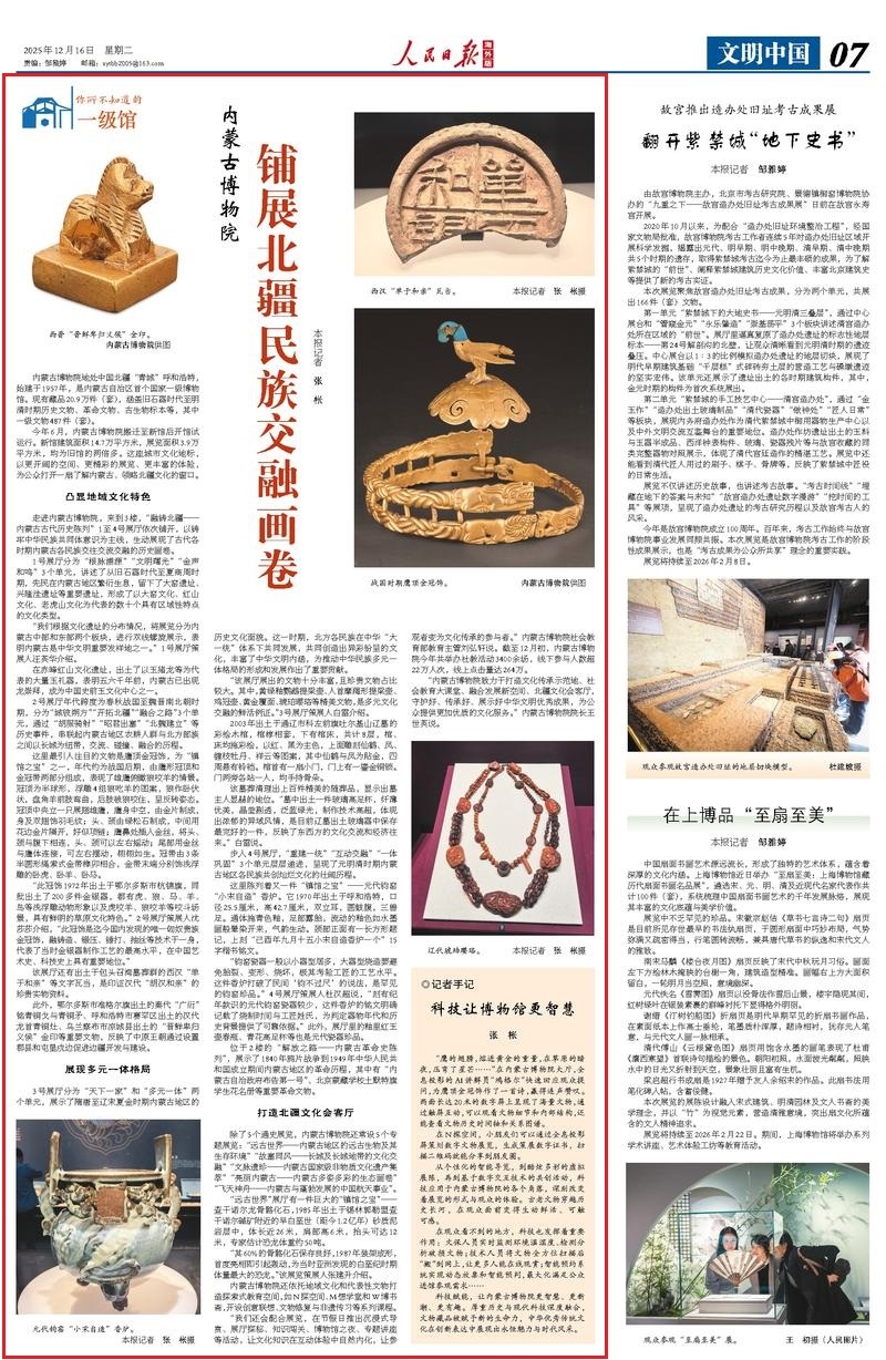 12月16日,《人民日?qǐng)?bào)海外版》刊發(fā)《內(nèi)蒙古博物院 鋪展北疆民族交融畫(huà)卷》,報(bào)道內(nèi)蒙古自治區(qū)首個(gè)國(guó)家一級(jí)博物館今年6月搬遷至新館后開(kāi)館試運(yùn)行。新館建筑面積14.7萬(wàn)平方米,展覽面積3.9萬(wàn)平方米,均為舊館的兩倍多。這座城市文化地標(biāo),以更開(kāi)闊的空間、更精彩的展覽、更豐富的體驗(yàn),為公眾打開(kāi)一扇了解內(nèi)蒙古、領(lǐng)略北疆文化的窗口。