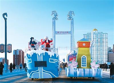 蒙古包群的另一邊,以馬為主題的彩色冰雕喜迎農(nóng)歷馬年;13米長的未來機車巨型冰雕融合聲光電技術,營造科幻氛圍;以曲棍球冠軍群像為主題的雪雕群成為游客拍照留念的打卡點。