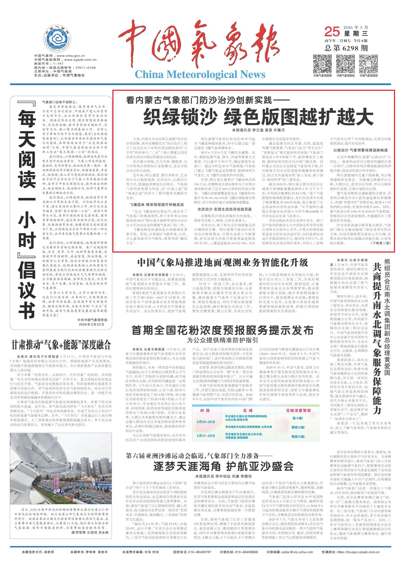 2026年3月25日《中國氣象報》第1版刊發(fā)了《看內(nèi)蒙古氣象部門防沙治沙創(chuàng)新實踐—織綠鎖沙綠色版圖越擴越大》的文章,報道了內(nèi)蒙古阿拉善盟啟動沿黃光伏治沙等“三北”六期防沙治沙重點工程,氣象部門精準賦能飛播造林、光伏治沙、以路治沙三大模式,提供全流程技術(shù)支撐,大幅提升治沙成效與生態(tài)經(jīng)濟效益,筑牢北方生態(tài)安全屏障。