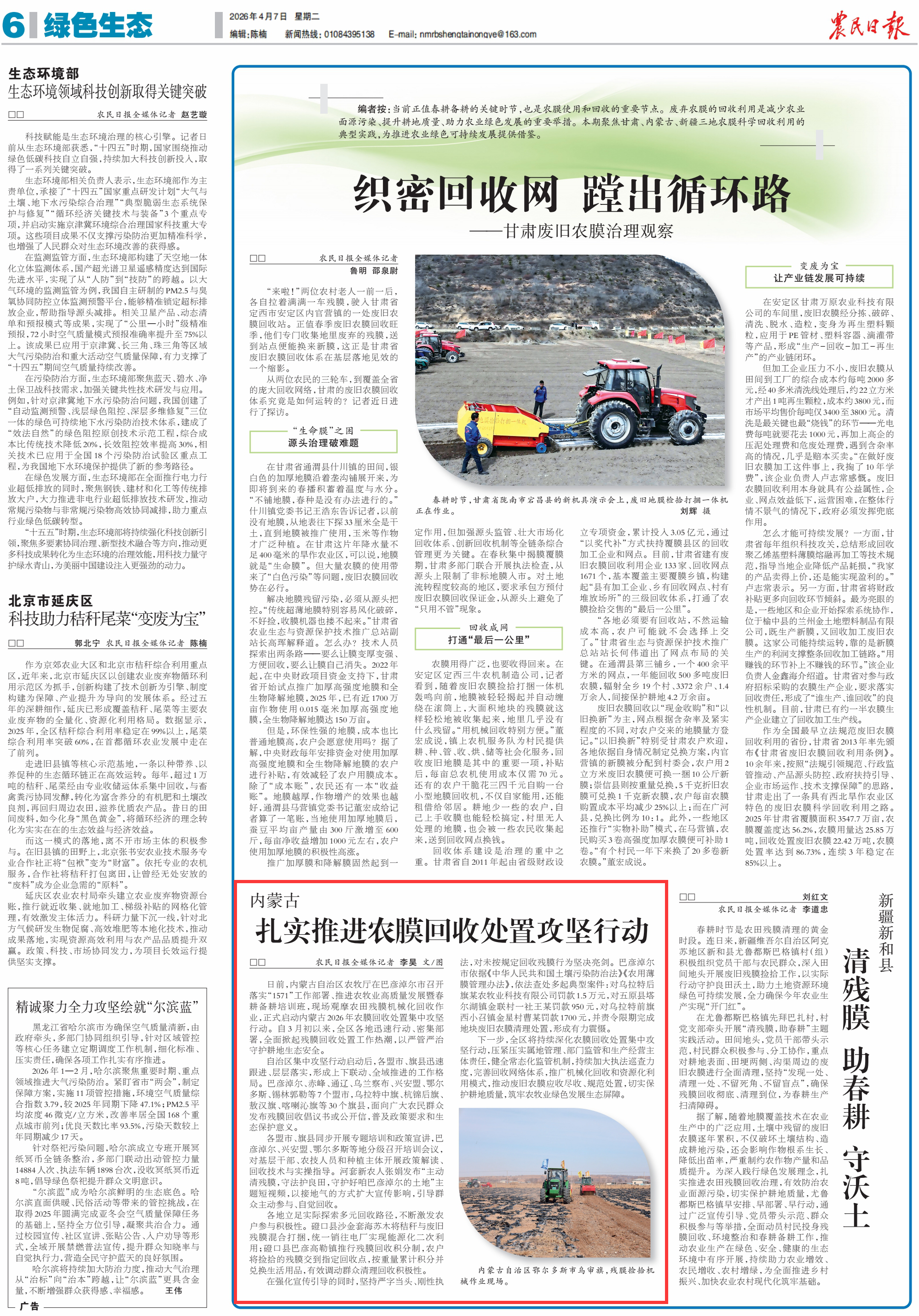 2026年4月7日,《農(nóng)民日?qǐng)?bào)》第6版刊發(fā)題為《內(nèi)蒙古扎實(shí)推進(jìn)農(nóng)膜回收處置攻堅(jiān)行動(dòng)》的文章,報(bào)道了日前,內(nèi)蒙古自治區(qū)農(nóng)牧廳在巴彥淖爾市召開(kāi)落實(shí)“1571”工作部署、推進(jìn)農(nóng)牧業(yè)高質(zhì)量發(fā)展暨春耕備耕培訓(xùn)班,現(xiàn)場(chǎng)觀(guān)摩農(nóng)田殘膜機(jī)械化回收作業(yè),正式啟動(dòng)內(nèi)蒙古2026年農(nóng)膜回收處置集中攻堅(jiān)行動(dòng)。自3月初以來(lái),全區(qū)各地迅速行動(dòng)、密集部署,全面掀起殘膜回收處置工作熱潮,以嚴(yán)管?chē)?yán)治守護(hù)耕地生態(tài)安全。