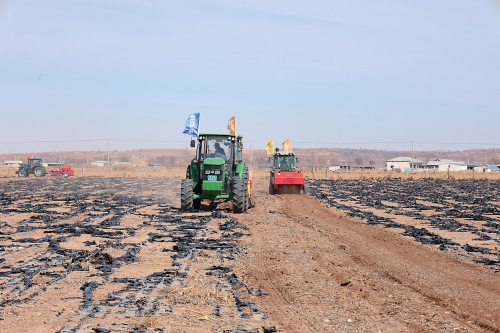 內(nèi)蒙古自治區(qū)鄂爾多斯市烏審旗,殘膜撿拾機(jī)械作業(yè)現(xiàn)場(chǎng)。