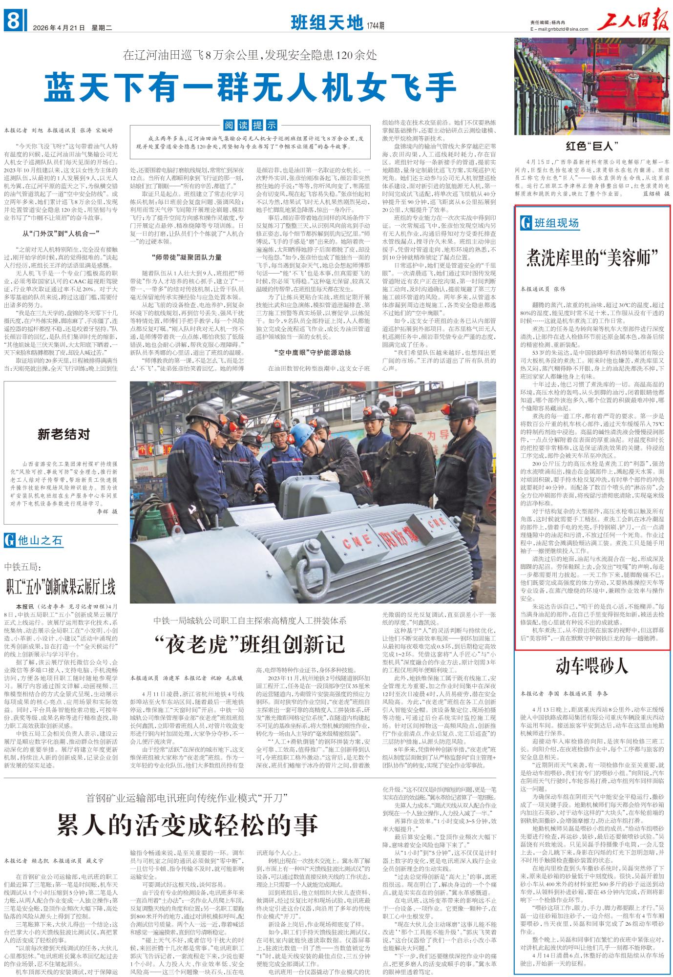 2026年4月21日,《工人日報》第8版刊發(fā)題為《煮洗庫里的“美容師”》的文章,報道了53歲的朱運達,是中國鐵路呼和浩特局集團有限公司大板機務段的煮洗工,煮洗工們從不曾出現(xiàn)在旅客的視野中,但這群幕后“美容師”,一直在默默守護鋼鐵巨龍的每一趟馳騁。