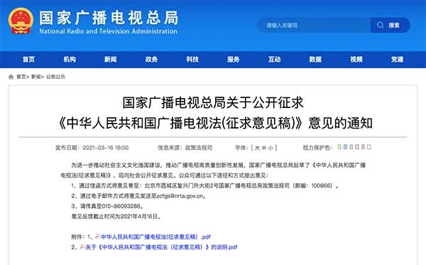 3月16日,國家廣播電視總局發(fā)布《中華人民共和國廣播電視法(征求意見稿)》(以下簡稱“征求意見稿”),向社會公開征求意見。征求意見稿分為總則、業(yè)務(wù)準(zhǔn)入、制作播放、傳輸覆蓋、公共服務(wù)、扶持促進、安全保障、監(jiān)督管理、法律責(zé)任和附則,共10章80條。意見反饋截止日期為2021年4月16日。