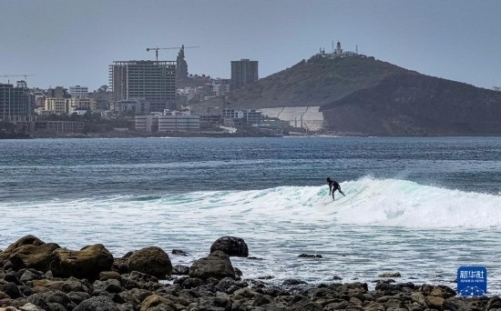 5月14日,一名沖浪愛(ài)好者在塞內(nèi)加爾首都達(dá)喀爾的海邊沖浪。