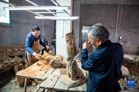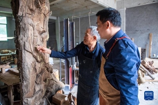 5月23日,在洞口縣巖山鎮(zhèn)陽(yáng)家山村,洞口木雕非遺傳承人傅立先(左)和父親傅金林在創(chuàng)作木雕作品。