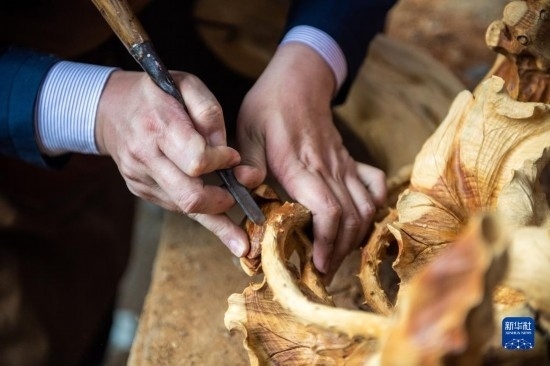 5月23日,在洞口縣巖山鎮(zhèn)陽(yáng)家山村,洞口木雕非遺傳承人傅立先在創(chuàng)作木雕作品《絲綢之路》。