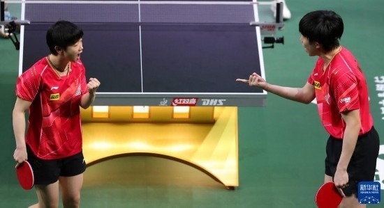 5月26日,王楚欽(右)/孫穎莎在比賽中慶祝