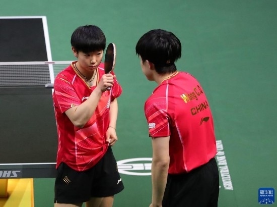 5月26日,王楚欽(右)/孫穎莎在比賽中交流。
