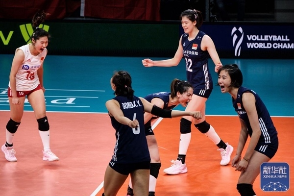 中國隊(duì)球員在比賽中慶祝得分。2022年9月28日,在荷蘭阿納姆舉行的2022世界女排錦標(biāo)賽第一階段D組小組賽中,中國隊(duì)3:0戰(zhàn)勝日本隊(duì)。新華社記者 孟鼎博 攝