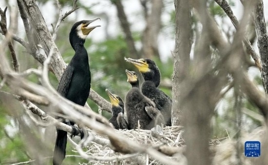 準(zhǔn)備學(xué)習(xí)飛翔的幾只鸕鶿幼鳥(niǎo)棲息在密云水庫(kù)“鳥(niǎo)島”的樹(shù)上(5月31日攝)。