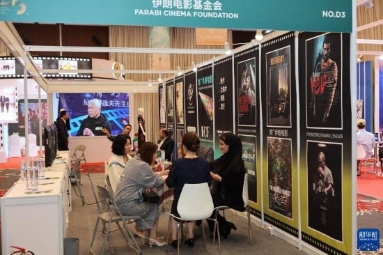 6月10日,咨詢者在第25屆上海國際電影節(jié)電影市場(chǎng)伊朗電影基金會(huì)展區(qū)與展商溝通。