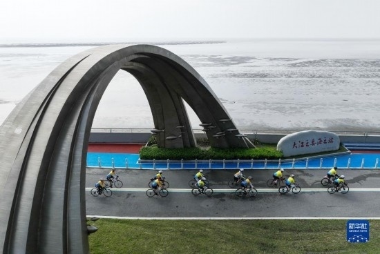 9月17日,騎行愛好者在啟東市江海文化景觀大道騎行(無人機(jī)照片)。