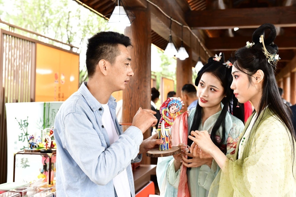 2023年9月26日,在第九屆尼山世界文明論壇“山東手造”精品展區(qū),與會人員在介紹國家級非遺曹州面人作品。新華社記者 郭緒雷 攝