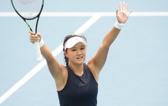 8月6日,中國隊選手郭涵煜在獲得網(wǎng)球女單冠軍后慶祝勝利。新華社記者 江宏景 攝