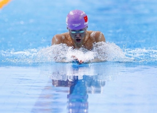 11月1日,南京市選手董志豪在比賽中,他獲得男子100米蛙泳公開組冠軍。當(dāng)日,第一屆全國學(xué)生(青年)運動會游泳項目比賽在廣西南寧開賽。新華社記者 胡星宇 攝