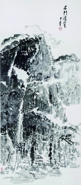 傳統(tǒng)中國(guó)畫講究筆墨技法,童中燾對(duì)此深研體悟。談到筆墨,普通觀眾往往覺(jué)得“玄虛莫辨”,一幅畫的筆墨高下、好壞如何判別?童中燾說(shuō):“古人云‘山水不出筆墨情景’,情景者境界,境能奪人,而筆能奪境?!秉S賓虹總結(jié)“筆法五種”“墨法七種”,“五筆”指的是平、圓、留、重、變,“七墨”指的是濃墨、淡墨、破墨、潑墨、積(漬)墨、焦墨、宿墨。童中燾吸收前人經(jīng)驗(yàn),總結(jié)歸為“五墨”:清、潤(rùn)、沉、和、活。他進(jìn)而指出,用筆用墨,凡達(dá)到“五筆”“五墨”的,就叫用筆好、用墨好。比如“清”,指的是“用筆用墨,筆路清澈,層層相積,無(wú)混濁相”。細(xì)觀童中燾筆下的山石樹(shù)木,雖筆墨點(diǎn)畫繁復(fù),但近看筆筆清晰,沉穩(wěn)勁道,收放自如,如同“以拔山舉鼎之力,為舞女插花”,比較于不善畫者的“弱、軟、飄、板、涂、抹”等弊病,其精妙之處立顯。