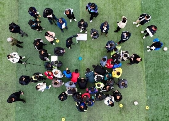 12月12日,學(xué)員參加“學(xué)轉(zhuǎn)英超”基層足球教練培訓(xùn)項(xiàng)目(無(wú)人機(jī)照片)。新華社記者 劉續(xù) 攝