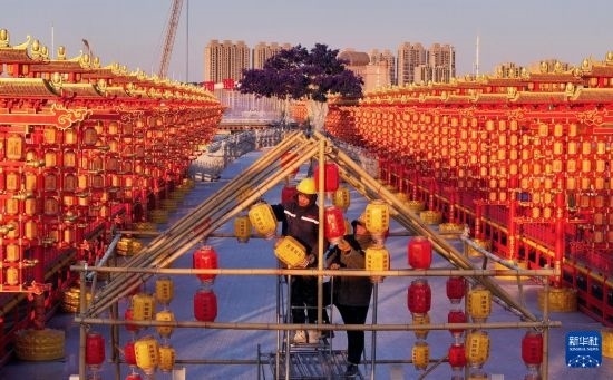 1月23日,工人在河北省唐山市豐南區(qū)河頭老街景區(qū)掛燈籠(無人機照片)。