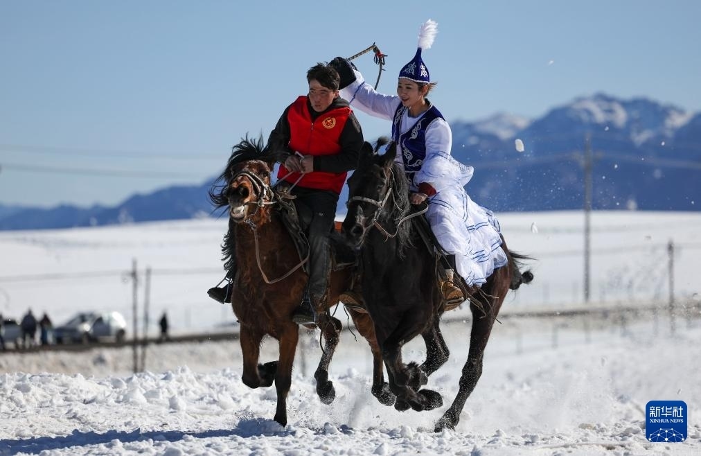 農歷大年初二,新疆烏魯木齊縣“春節(jié)八天樂”系列活動——傳統體育民俗鬧新春在甘溝鄉(xiāng)進行。村民們在冰雪覆蓋的烏拉斯臺草原上進行雪地賽馬、“姑娘追”、馬上拾銀、叼羊等比賽,歡度新春。