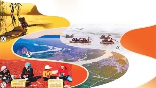圖④:一名筏工背著羊皮筏子前行。圖⑤:黃河岸邊的龍灣村。圖⑥:游客們在龍灣村附近乘坐羊皮筏子。圖⑦:龍灣村村民喜迎紅棗豐收。圖均為宋朝軍、俞寶榮攝影報道