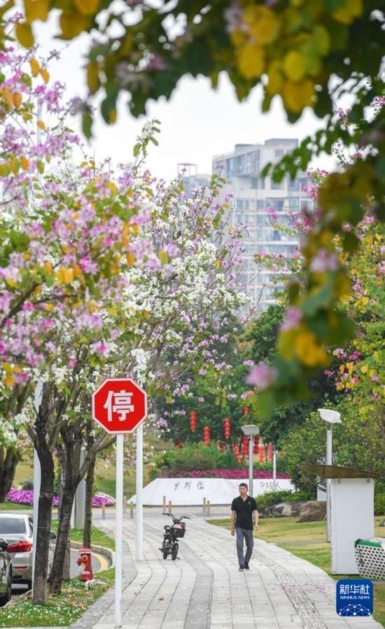 近日,廣東深圳街頭各色花卉爭相開放,人們來到街頭感受春季的暖意。