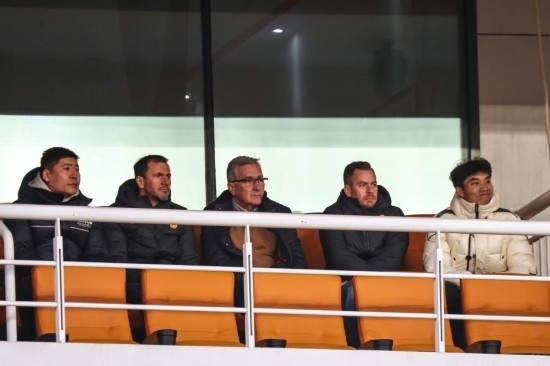 3月6日,中國國家男子足球隊(duì)主教練伊萬科維奇(中)在2023-2024賽季亞冠聯(lián)賽四分之一決賽首回合現(xiàn)場觀看比賽。新華社記者 朱崢 攝