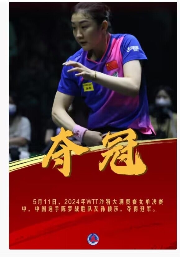 今天,在2024年WTT沙特大滿貫賽女單決賽中,中國選手陳夢戰(zhàn)勝隊(duì)友孫穎莎 ,奪得冠軍。祝賀陳夢,孫穎莎辛苦了!拼過就是勝利,繼續(xù)加油!(記者:王海洲)