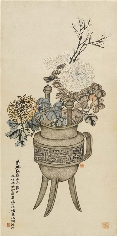 圖為清代趙之謙、程守謙中國畫《菊花博古圖軸》,上海博物館藏。