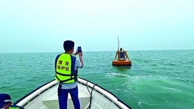 廣西合浦儒艮國(guó)家級(jí)自然保護(hù)區(qū)工作人員檢查海洋哺乳動(dòng)物水下聲學(xué)監(jiān)測(cè)浮標(biāo)。
