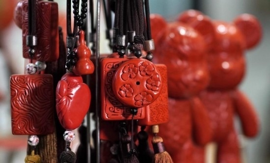 朱江設(shè)計制作的適合年輕人的雕漆配飾(6月5日攝)。