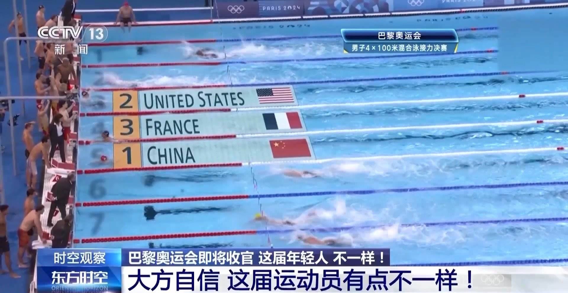 巴黎奧運(yùn)會游泳賽場最后一個比賽日,中國隊放了個大招。男子4X100米混合泳接力決賽上,中國隊力壓該項目40年“霸主”美國隊,以3分27秒46的成績奪冠。