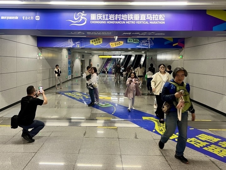 國慶前夕,這里剛舉辦了一場垂直馬拉松。賽事帶來品牌效應,前來打卡的人群絡(luò)繹不絕?!按怪瘪R拉松一般在摩天大樓里舉辦,如今地鐵站里居然能跑馬拉松,重慶總是能給游客帶來驚喜。”來自河北的游客張楠說。