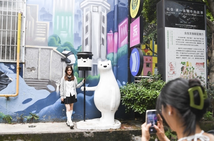圖為游客在重慶江北區(qū)北倉文創(chuàng)街區(qū)拍照。新華社記者王全超 攝