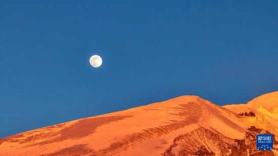 這是在新疆塔什庫爾干塔吉克自治縣慕士塔格冰川公園拍攝的夕陽下的慕士塔格峰(1月12日攝,無人機照片)。