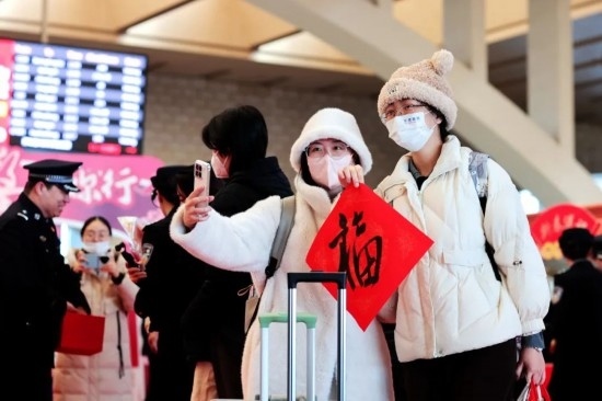 2025年鐵路春運(yùn)“萬福迎春”活動現(xiàn)場,一位外籍旅客自拍留念。