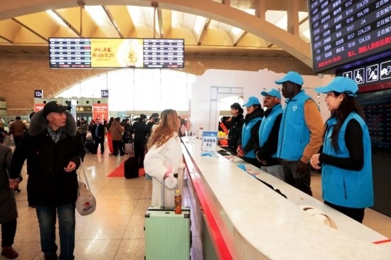 1月14日春運(yùn)首日,外籍留學(xué)生志愿者走進(jìn)石家莊站為旅客服務(wù)。