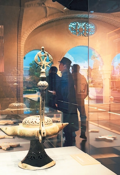 第四部分“剔透耀彩·波斯玻璃器”展示了從阿契美尼德王朝到薩非王朝2000多年間伊朗玻璃生產(chǎn)工藝的變遷。伊朗目前發(fā)現(xiàn)的玻璃最早可追溯到公元前1200年。進(jìn)入阿契美尼德王朝,玻璃器生產(chǎn)迎來(lái)繁榮,出現(xiàn)了自由吹制和有模吹制兩大制作工藝。瓶身兩側(cè)裝飾著波浪紋的綠色硅玻璃雙體眼影液瓶、巧妙融合兩種顏色的長(zhǎng)頸玻璃瓶醒酒器、用于盛放玫瑰水的花卉紋玻璃壺……琳瑯滿目的玻璃器體現(xiàn)了伊朗人的生活美學(xué)。
